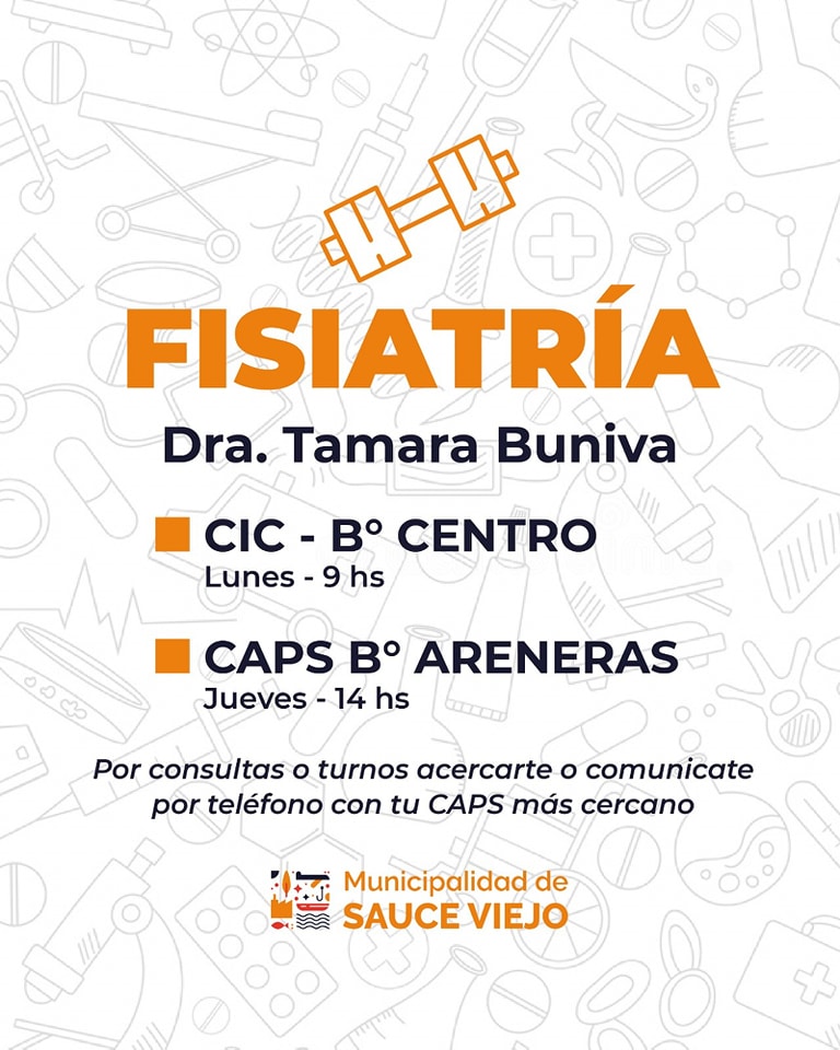 La Dirección de salud de la Municipalidad de Sauce Viejo informa que contamos con la dra. Tamara Buniva especialista en Medicina Física y Rehabilitación (fisiatría), y sub especialista en rehabilitación infantil, Mat. 18448. Días y horarios de atención: Lunes 9 hs. en el CIC Jueves 14hs en Areneras. Para turnos o consultas llama o acércate […]